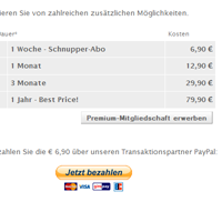Die verschiedenen Abo-Pakete (Schnupper-Abo, 1 Monat, 1 Jahr usw.) können in Preis und Laufzeit beliebig im Admin Panel eingestellt werden, ebenso die Zahlungsabwicklung via PayPal.